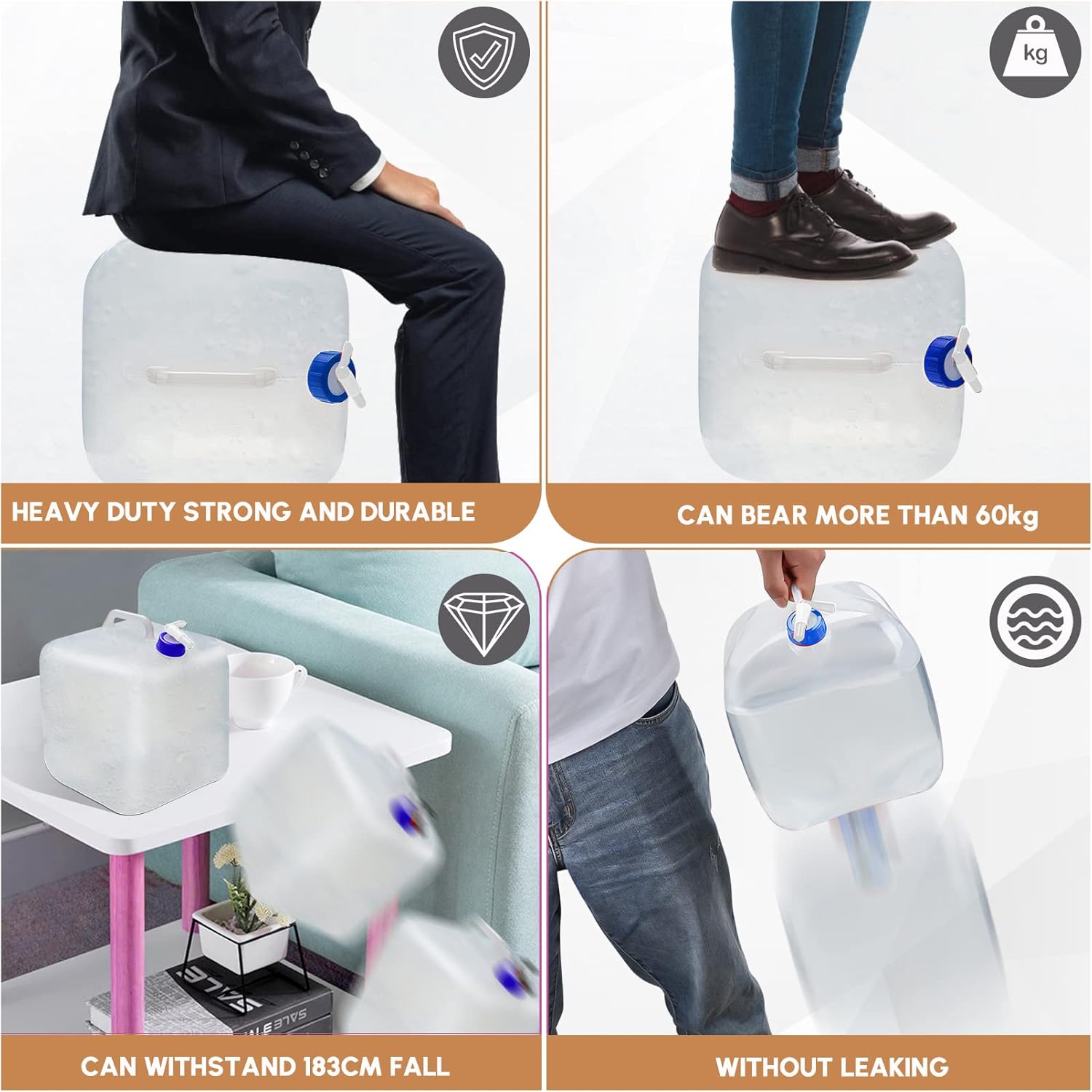 - LEAK-PROOF Maßgefertigter Deckel und Zapfhahn mit dichtungslosem Design bedeutet keine Lecks oder Teile zu ersetzen. Guter Wasserdurchfluss am Zapfhahn. Dickerer Deckel, um starkem Druck standzuhalten. Einfaches An- und Abschalten des Zapfhahns mit kontrollierbarem Durchfluss. Unser erstklassiger, zusammenklappbarer Behälter ist Einteiliges Design ohne undichte Nähte oder bruchgefährdete Griffe. Langlebig und verlässlich.