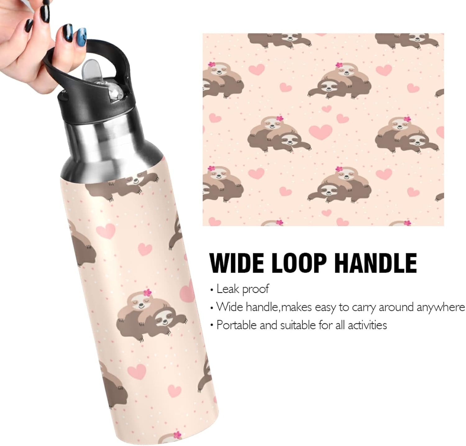 Vnurnrn Faultier Niedliches Cartoon-Babyherz Trinkflasche Wasserflasche mit Strohhalm 600ML, Thermosflasche Vakuumisolierte aus Edelstahl 18/8, BPA-frei für Kinder Sport Wandern Schule